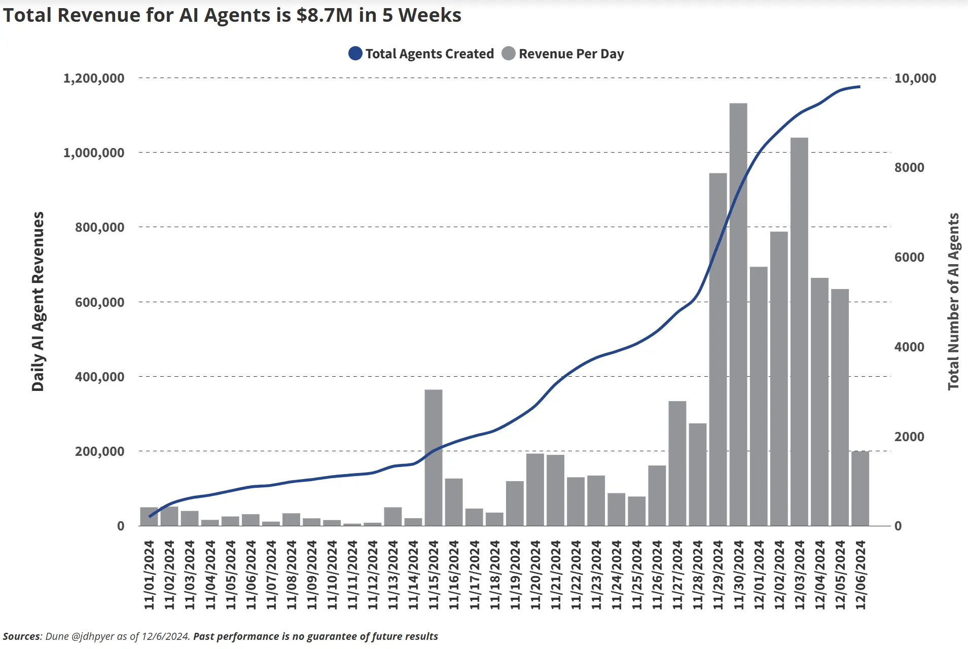 In the data from last year, it is evident that there was a need for AI agents with more flexibility and open-endedness. Nearly 10,000 AI agents related to web3 were created before 2024, despite a decline in agent revenues. It is clear that AI agents continue to multiply at a staggering rate. However, the ability of these agents to create value has not kept up with their rapid growth.