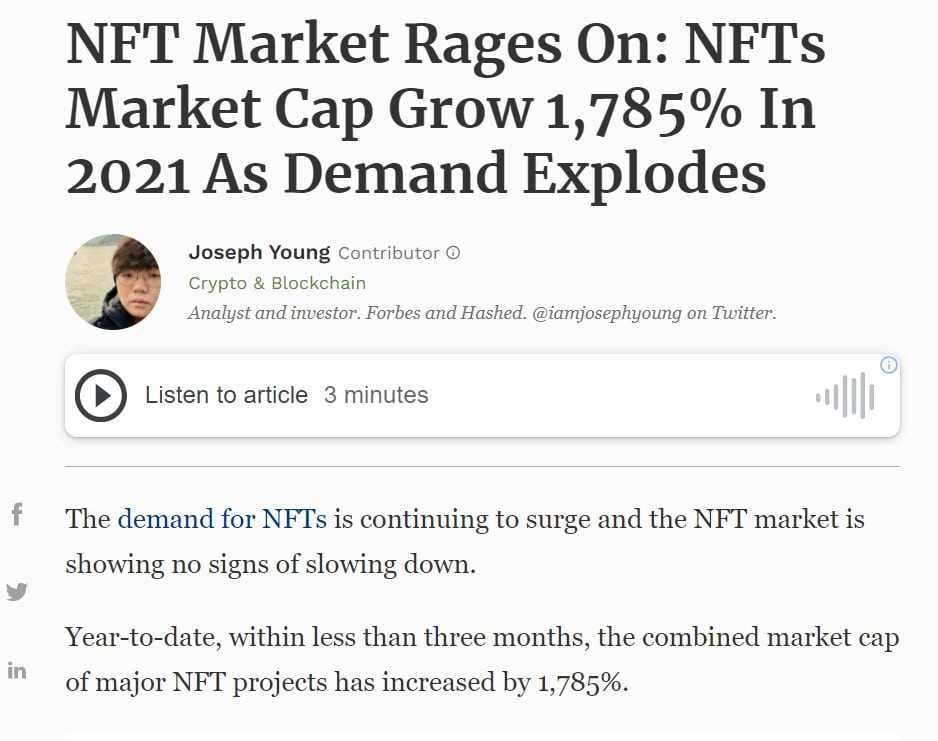 Entrepreneurs, corporations, authors, videographers, educators, supply chain companies, athletes, social media personalities selling minted tweets, even government officials are taking advantage of this technology. The ease in which an NFT can be created, purchased, and sold has come a long way since the first piece of digital art was minted as an NFT back in 2014 by Kevin McCoy, with the process being now more streamlined than ever.